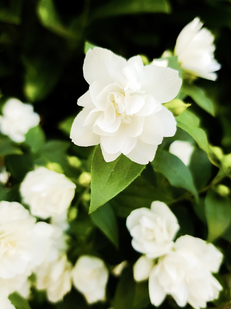 Boucles de ceintures inspirées de l’arbuste Philadelphus Manteau d’Hermine aux fleurs blanches agréablement parfumées.
