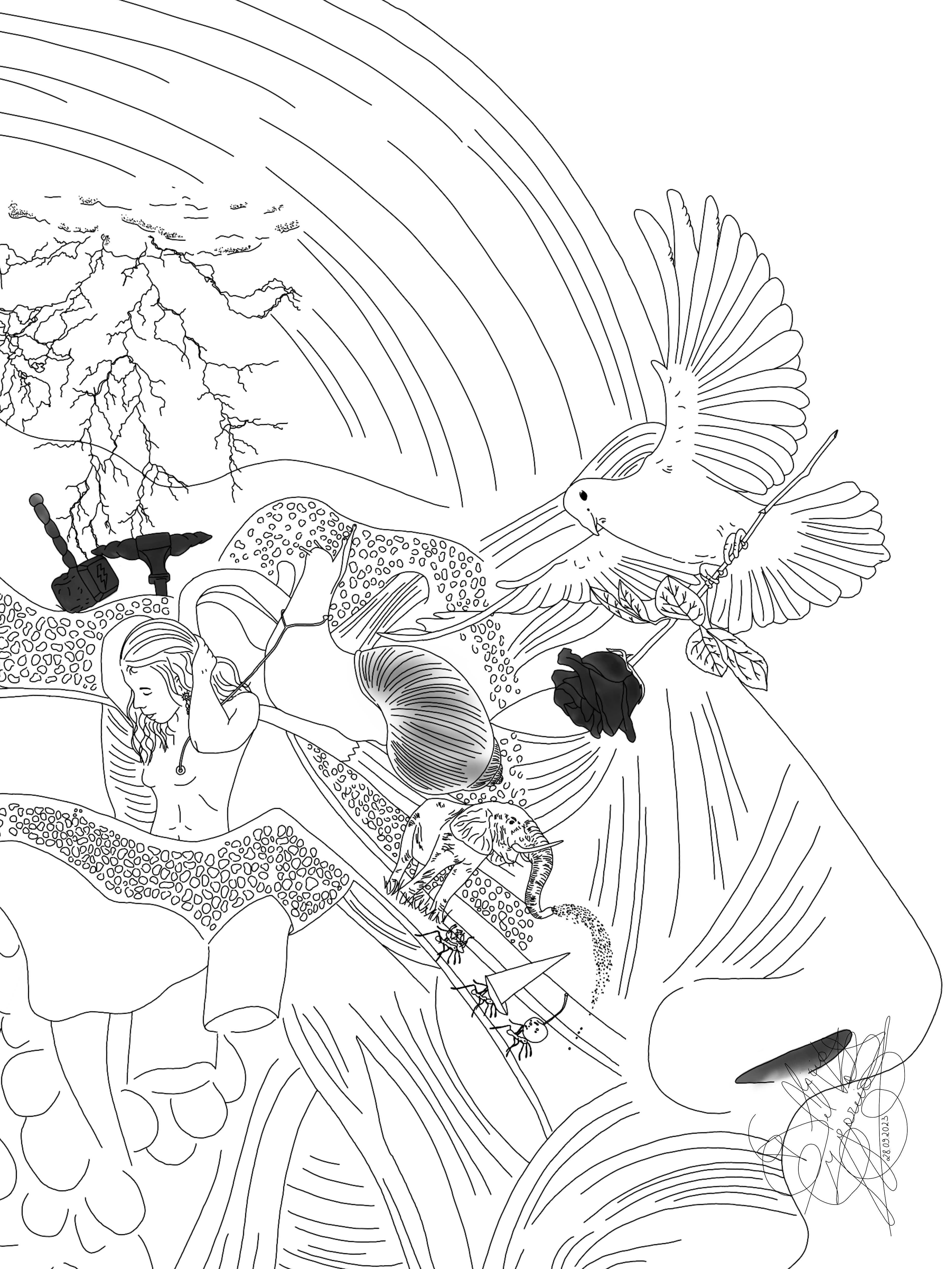 J’aime expliquer mes pensées par l’art du dessin, ce dessin en particulier explique qu’on a pas obligatoirement besoin d’une bible ou d’un professeur pour connaître la différence entre le bien et le mal, nos parents ont naturellement se rôle lors de notre éducation, mais il ne faut pas oublier qu’on a été créé doté d’une conscience, de l’intelligence et nos 6 sens nous permettent de voir, de sentir, de goûter, de toucher, d’entendre et en plus grâce à c’est 5 premier sens, le 6 ème sens, celui de l’intuition se développe grâce à nos expériences sensorielles, et ce sens en particulier nous permet de savoir de part nos expériences précédentes et leurs conséquences si ce qu’on s’apprête à penser ou à faire est bien ou mal, sûr ou dangereux, bon ou mauvais.