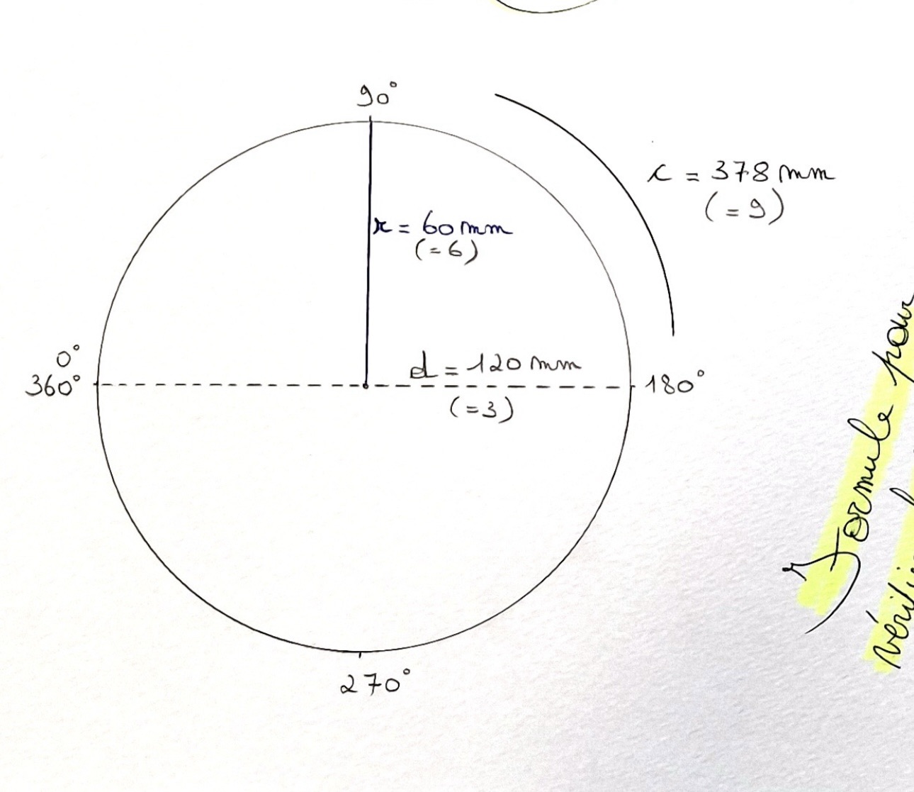 378 mm est la circonférence du cercle d’un rapporteur (rapporte heures) de 60mm de rayon, 360 degrés mais 378mm de circonférence.